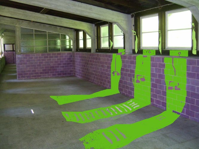 Am Boden sind die Schattenrisse der Liegepritschen mit Kissen und Decken als Cutout-Silhouetten in karierter Tapete (den historischen Stoffmustern nachempfunden) aufgeklebt. Dasselbe Muster tragen die Schatten der Handtücher an den noch vorhandenen rostigen Haken.
