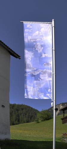 Eine ebenfalls traditionelle Methode, sich optisch über größere Distanzen bemerkbar zu machen, ist das Hissen von Fahnen aller Art. Die Flagge zeigt fragmentarische "Himmelsausschnitte" und symbolisiert die Omnipräsenz, quasi ein "pars pro toto" von Klang im Raum. Dort, wo die Fahne gehisst wird, da ist "jemand".